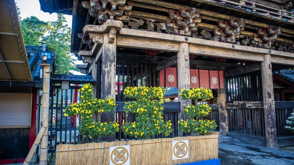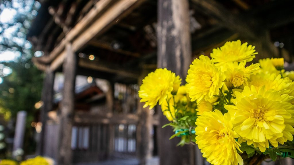 黄色い菊と楼門のコントラストが美しいですね(*^^*)