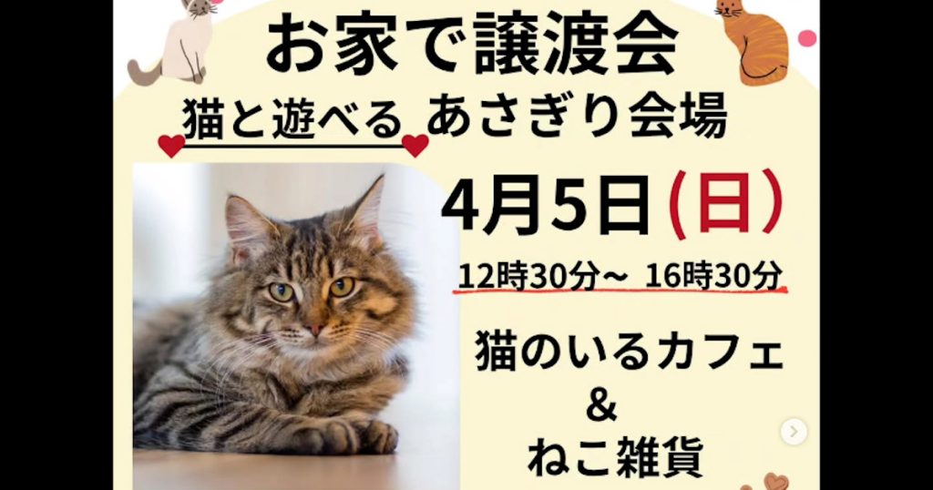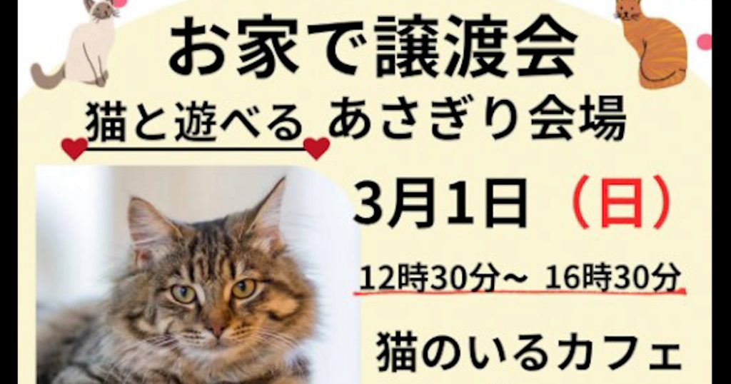 【日時】2026年3月1日(日)12:30〜16:30 暖かい室内で、ずっとのお家を待っている猫たちとゆっくり過ごせます。見学のみでもOK◎ 参加を希望される方は事前にお問い合わ... -