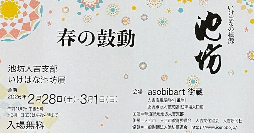 【日時】2026年2月28日(土)10:00〜17:00 3月1日(日)10:00〜16:00 季節のうつろいを花で感じる、いけばなの展示会。生命の芽吹きや躍動感をテーマにした作品が並び... -