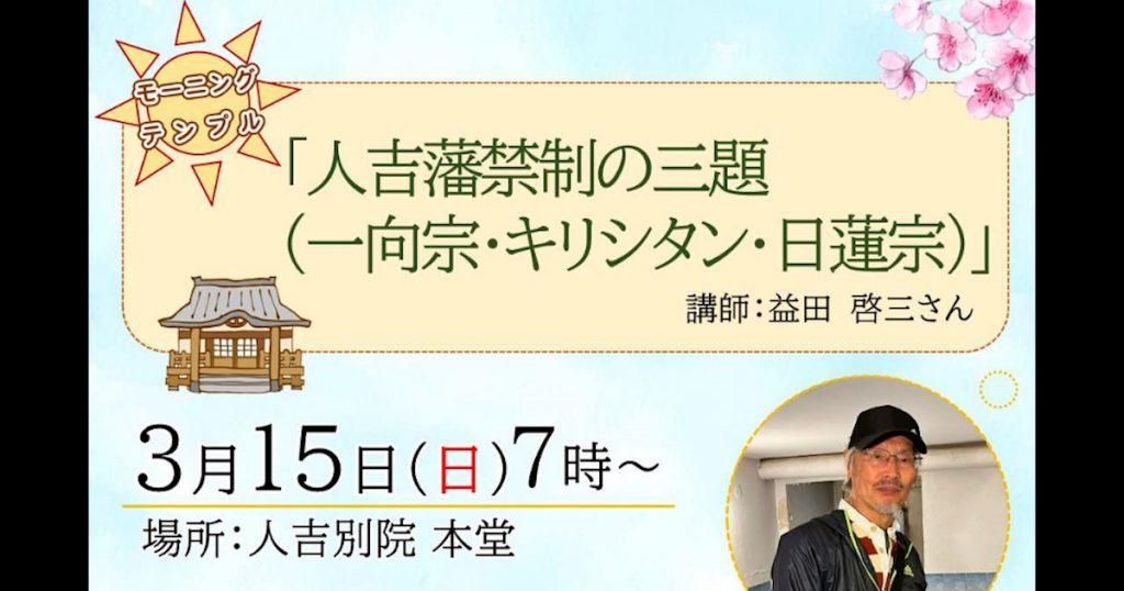 【日時】2026年3月15日(日)7時〜 一向宗・キリシタン・日蓮宗――。人吉藩の「禁制」をめぐる3つのテーマを手がかりに、地域の歴史と信仰の背景をひもとく講話です。朝...