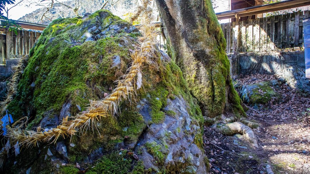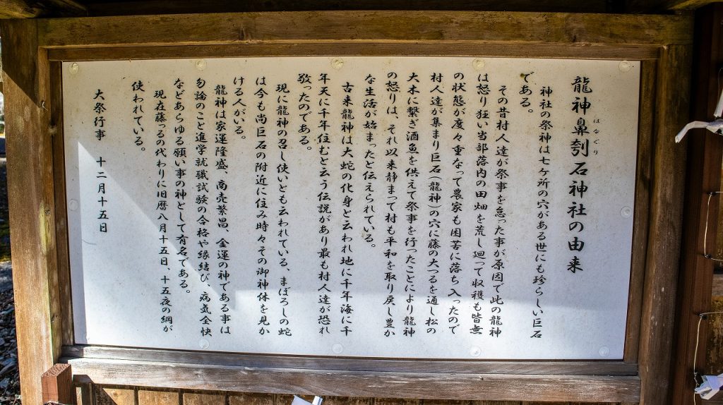 この巨石は、かつて祭りごとを怠った村に龍神の怒りが降りかかり、それを鎮めるために松の木に繋ぎ、供物を捧げて災厄を鎮めたという伝承があります
