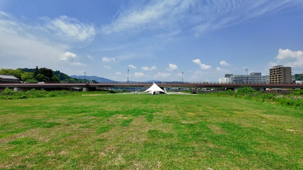 中川原公園は、熊本県人吉市にあり、球磨川にかかる「大橋」の中洲部分に位置する河川沿いの公園です