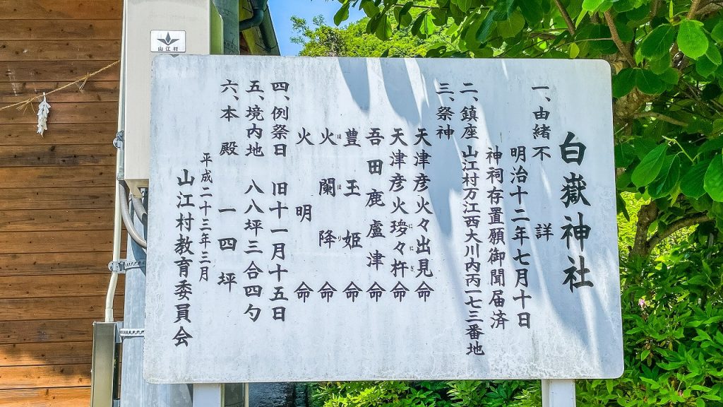 神社としての例大祭などの情報は確認できていませんが、近くに「白岳大明神」という名称で呼ばれている神社もあり、地域住民による維持管理の記録が山江村議会の議事録などで言及されています