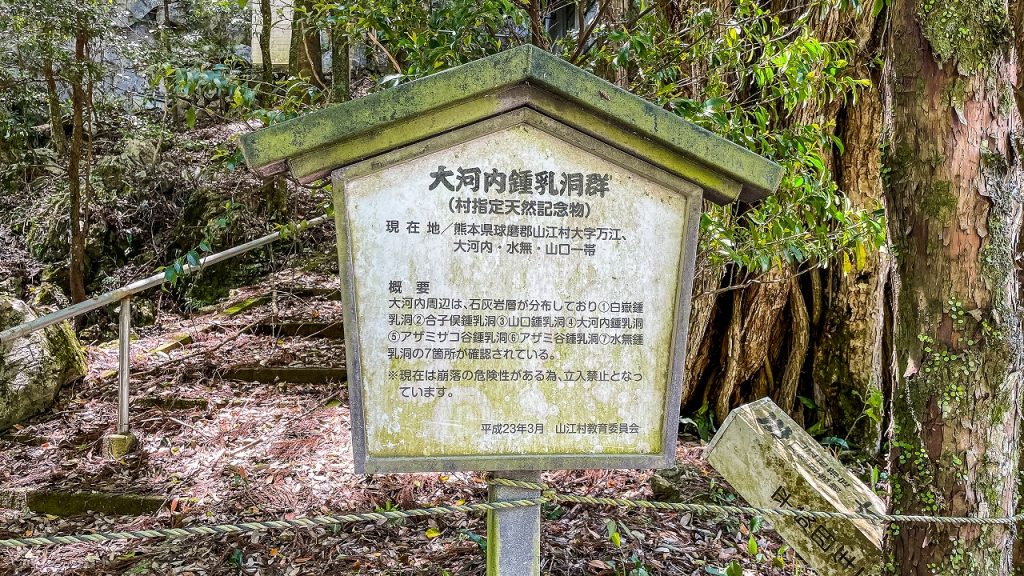 「大河内鍾乳洞群 万江丙大河内・水無・山口一帯、7箇所」として、山江村の天然記念物に指定されている