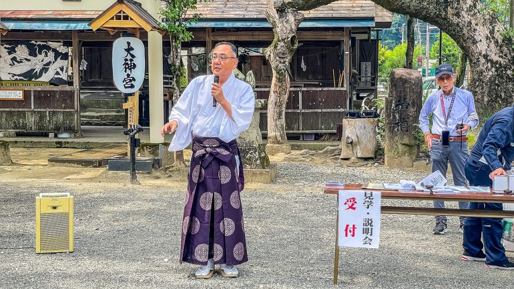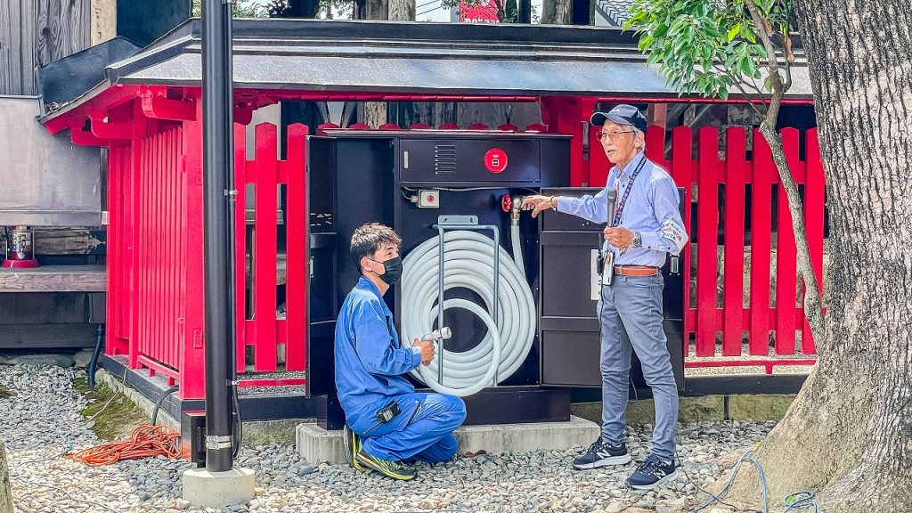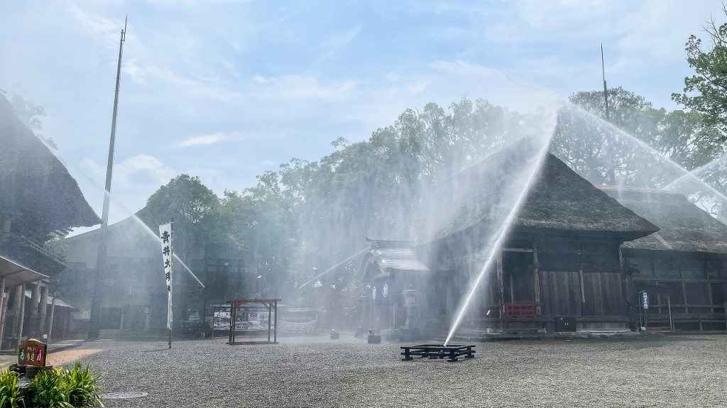 放水実演では、実際に建物を囲むように放水がなされ、強い水圧の“水のカーテン”が神社を包む様子を見せることで、防火機能の有効性と、万が一の際の安心感を訴える演出がなされました