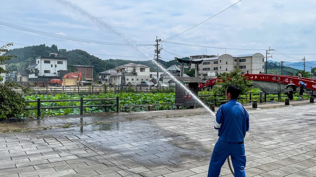 放水実演では、放水銃から放たれた勢いあふれる水が楼門や拝殿を包むように流れて、その迫力と美しさに息を飲みました。普段見ることのない“神社を守る力”をリアルに体感できる貴重な時間でした