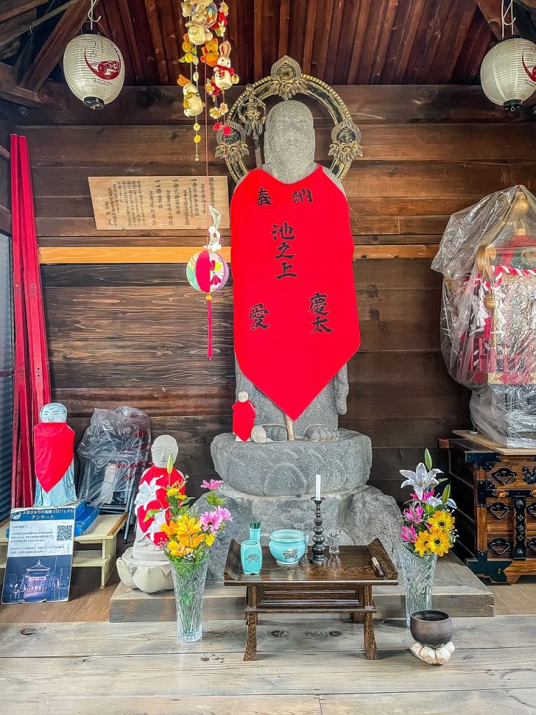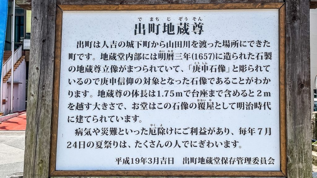 江戸時代・明暦3年(1657年)に造立された石製の地蔵尊立像が祀られているお堂で、石像の体長は約1.75m、台座を含めると2mを超える大きさがあります