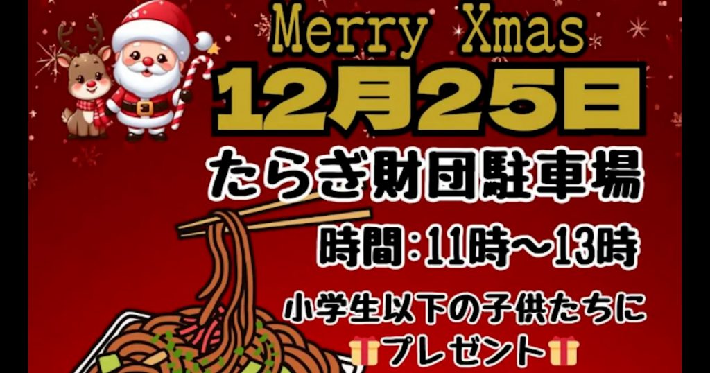 開催日 令和7年12月25日 11:00~13:00 「屋台のやきそば」&「揚げ!たいやき」小学生以下のお子さんを対象にプレゼントします🎁ささやかではありますが、地域の子供た… -