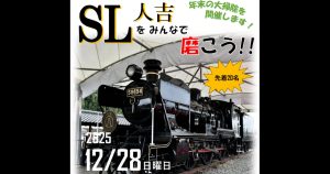 開催日 令和7年12月28日 13:30~募集は終了しました 11月16日から動く状態での展示を始めたSL人吉。みんなで磨いて、今年の頑張りをねぎらいませんか? 普段は柵越しで…