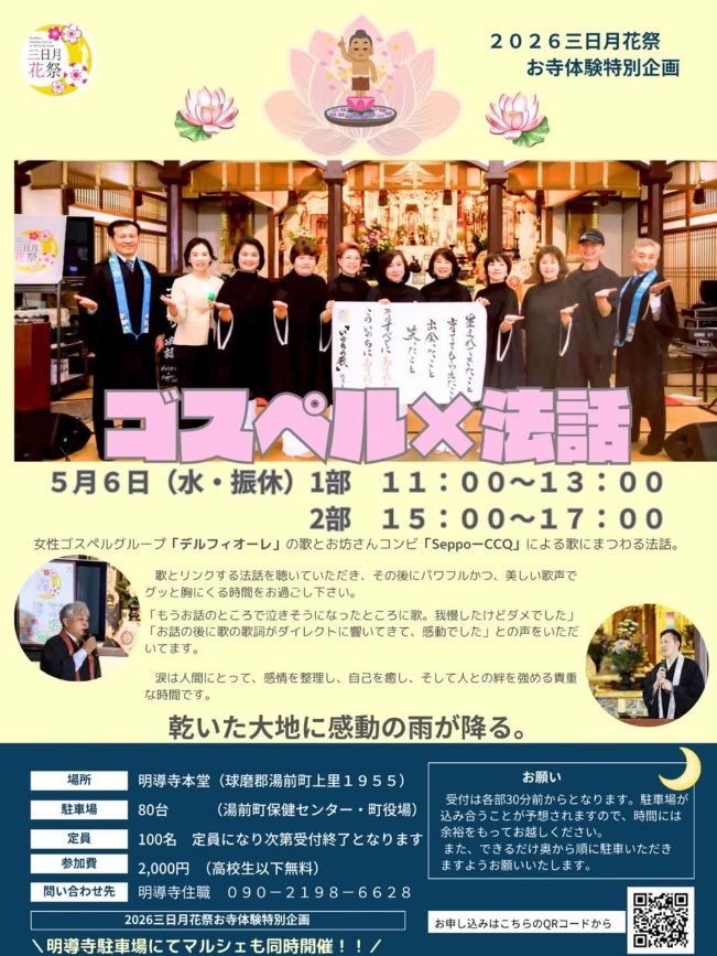 ・女性ゴスペルグループ「デルフィオーレ」の歌と、お坊さんコンビ「Seppo-CCQ」による歌にまつわる法話