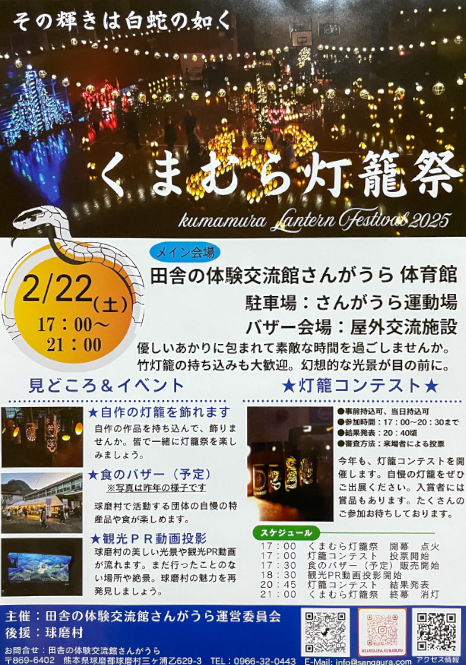 | 17:00 くまむら灯籠祭開幕 灯籠コンテスト投票開始 17:30 食のバザー販売開始 18:30 観光PR動画投影開始 20:45 灯籠コンテスト結果発表 21:00 くまむら灯籠祭閉幕 |