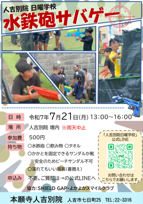 | 水鉄砲、飲み物、タオル かかとを固定できるサンダルか靴 ※安全のためビーチサンダル不可 濡れてもいい服装(着替え) |