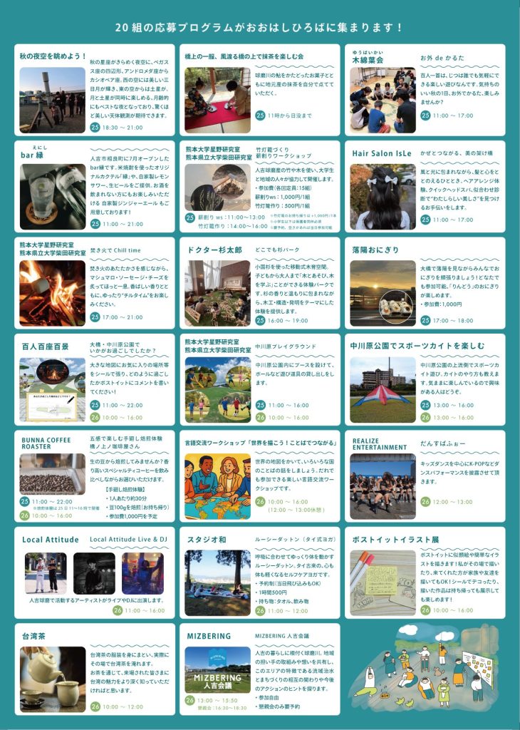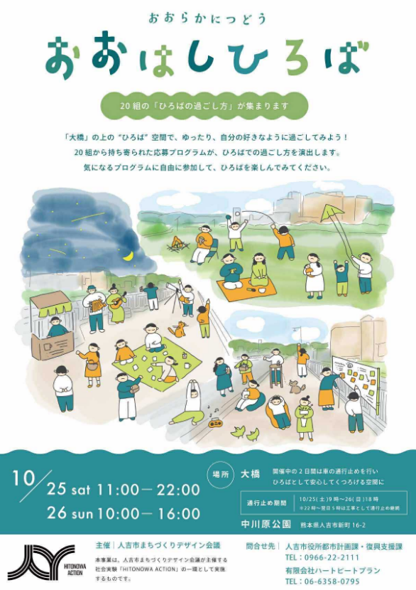 大橋一帯を「おおはしひろば」として開き、社会実験として、まちの人たちが楽しみ方を持ち寄り、それぞれの過ごし方を実践します