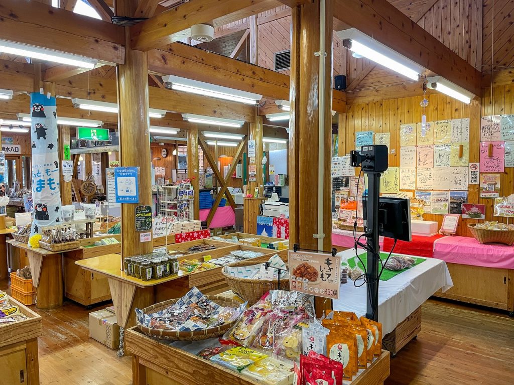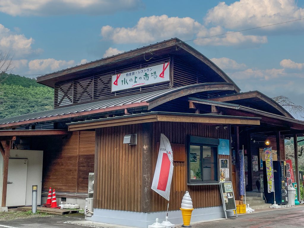 物産館 水の上の市場は、熊本県球磨郡水上村に位置する物産館で、市房ダム湖の近くにあります。地元で生産された新鮮な野菜や果物、手作りの饅頭や漬物など、多彩な特産品やお土産物が揃っています