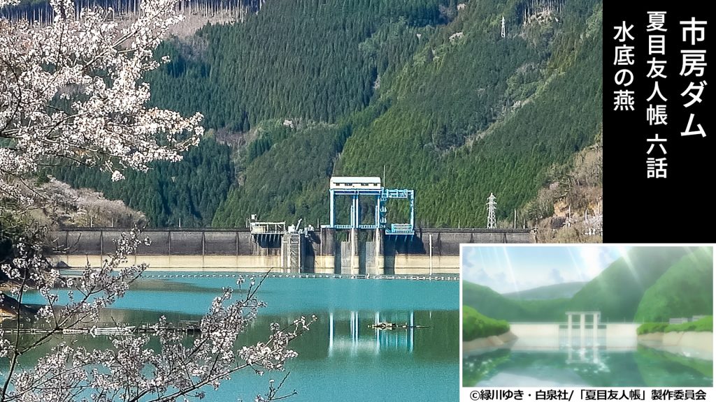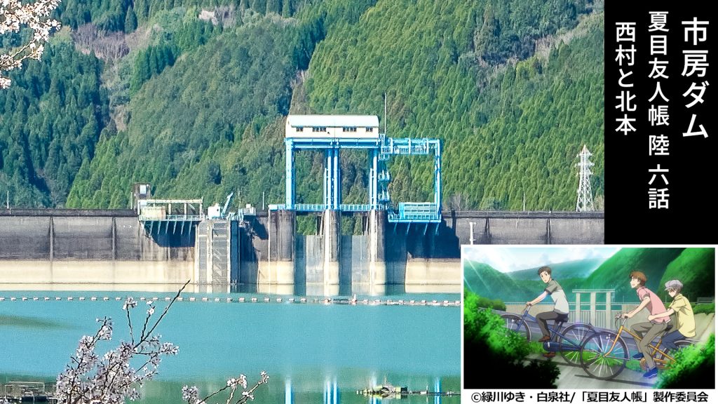 桜の名所としても有名な多目的ダムで市房ダム湖周辺には約1万本の桜が植えられ、春には満開の桜が湖面に映り込む美しい景観が広がり劇中では【夏目友人帳】【夏目友人帳 陸】に登場します