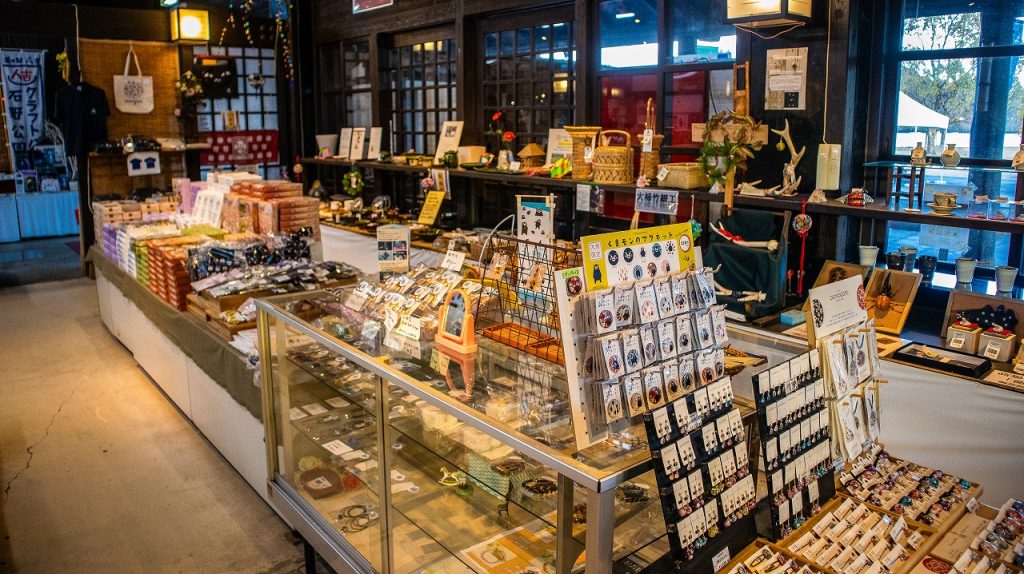 物産館の店内には、地元アーティストの手作り商品や熊本らしいアイテムがぎっしり。特にお土産として人気のキーホルダーや工芸品が目を引きます