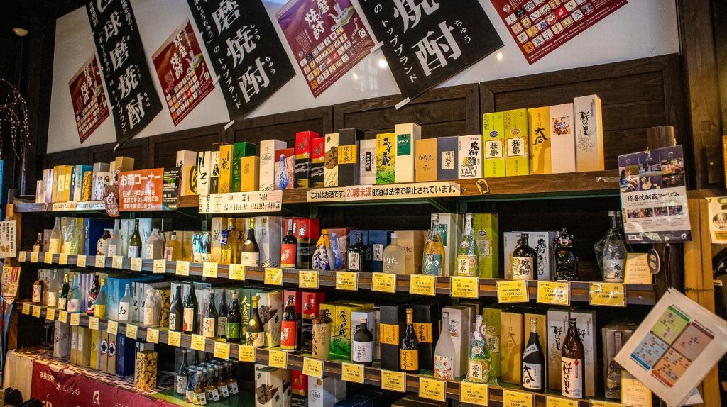 人吉球磨の名産品、球磨焼酎がずらりと並ぶコーナー