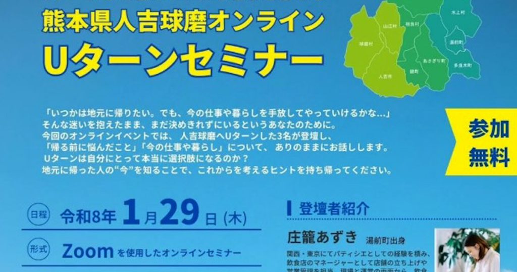 【開催日時】2026年1月29日(木)19:00〜20:00 「いつかは地元に帰りたい。でも仕事や暮らし、現実はどうなんだろう…」そんな迷いを抱える方へ。人吉球磨へUターンした... -